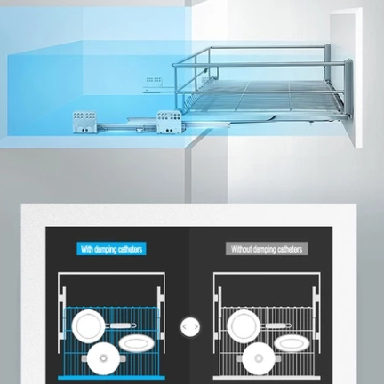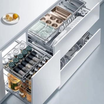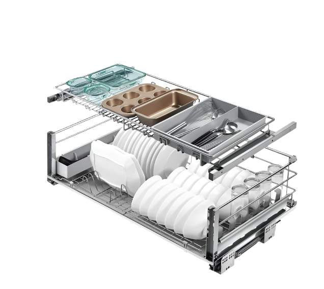 Le tiroir coulissant à deux niveaux offre une solution astucieuse et spacieuse pour organiser vos essentiels de cuisine. Le niveau supérieur accueille plaques de cuisson, boîtes à lunch et vaisselle, tandis que le niveau inférieur permet de ranger bols, assiettes et tasses, pour un rangement ordonné et à portée de main.