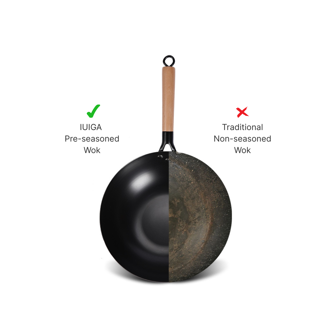 Surface sans produits chimiques : Sans revêtement et sans doublure synthétique, ce wok permet une cuisson sûre et naturelle sans lixiviation chimique.