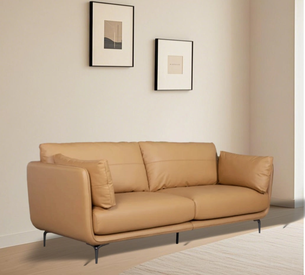 Le canapé Ember dégage un charme moderne avec son revêtement en cuir caramel et ses bords légèrement arrondis. Ses coussins moelleux et ses pieds fins en métal noir allient parfaitement confort et sophistication, ce qui en fait une pièce maîtresse accueillante des espaces de vie contemporains.