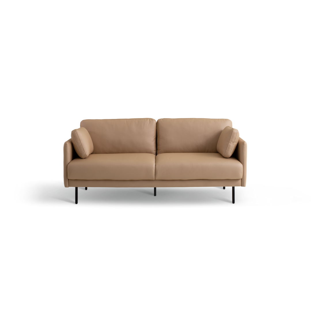 Le canapé Felix offre un design épuré et sophistiqué, revêtu d'un cuir lisse couleur caramel qui respire la chaleur et l'élégance. Doté de pieds fins en métal noir et de coussins moelleux et confortables, il allie confort et modernité.