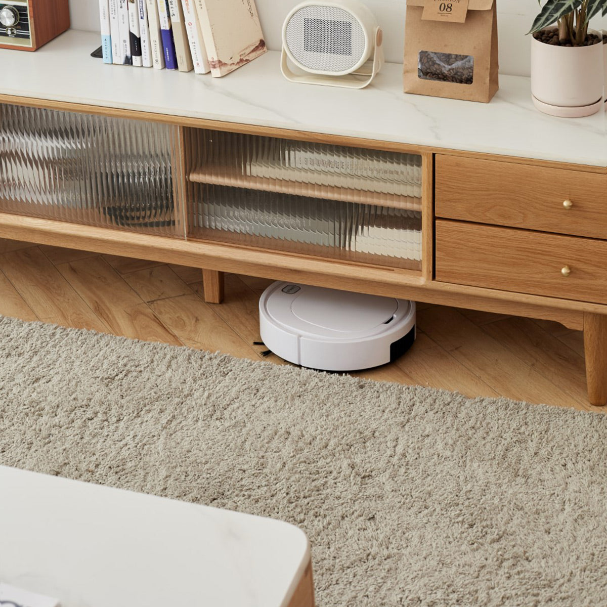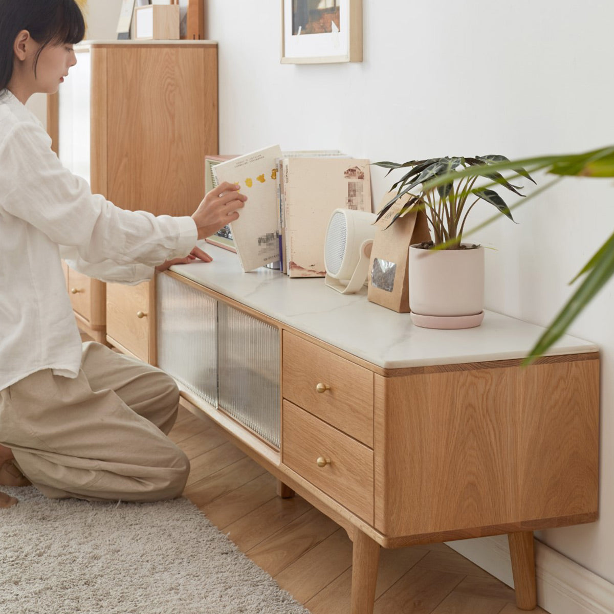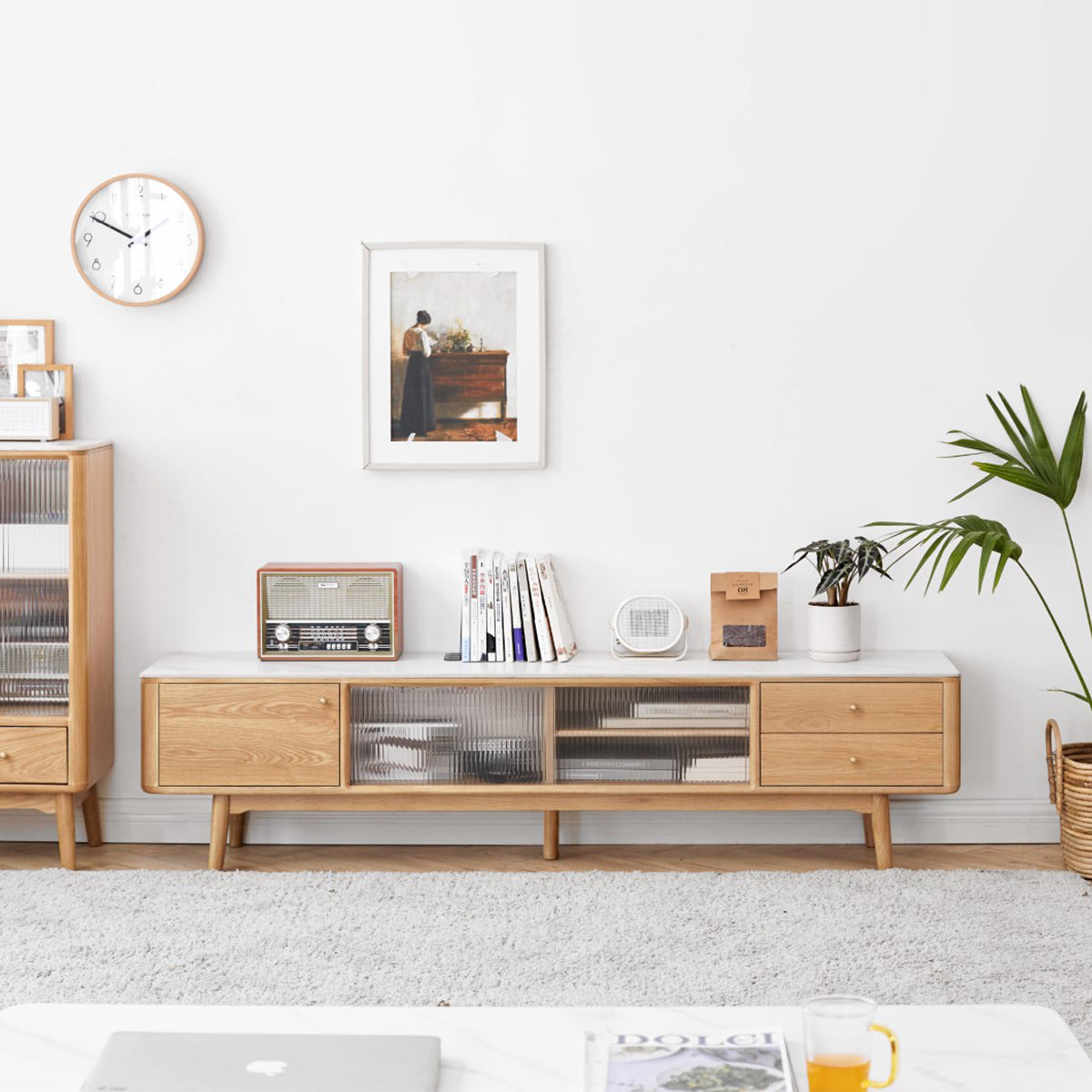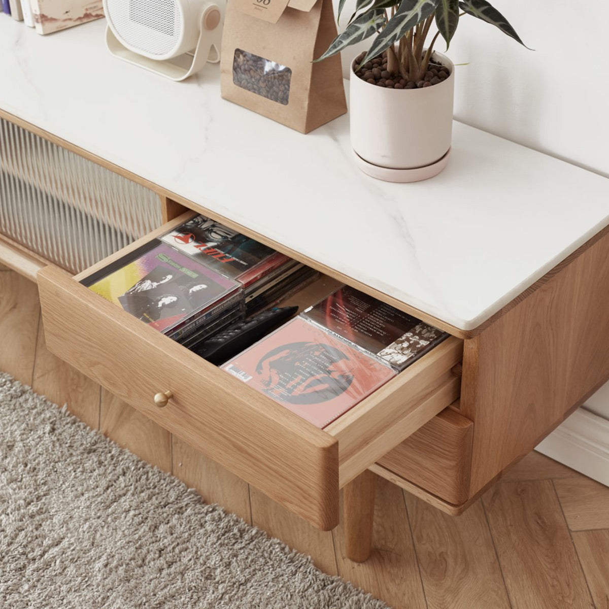 La console TV Marcy est dotée de belles portes coulissantes en verre cannelé et d'un grand espace de rangement, une solution parfaite pour les petits espaces pour ranger vos accessoires multimédias, plantes, objets de collection et plus encore.