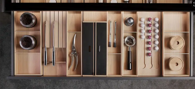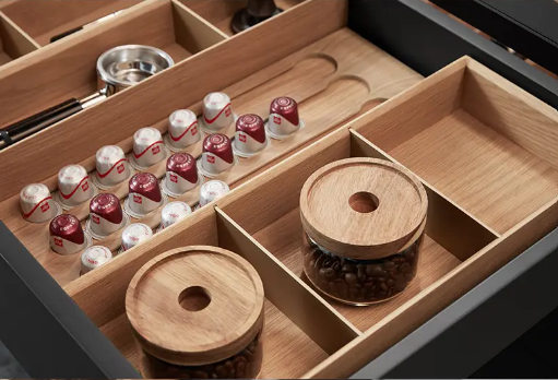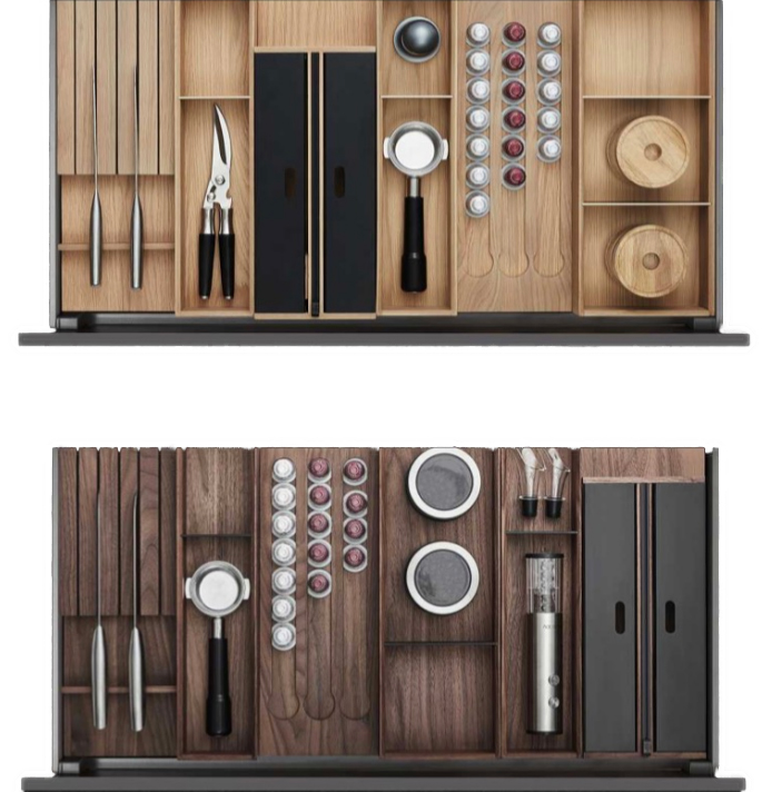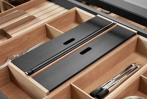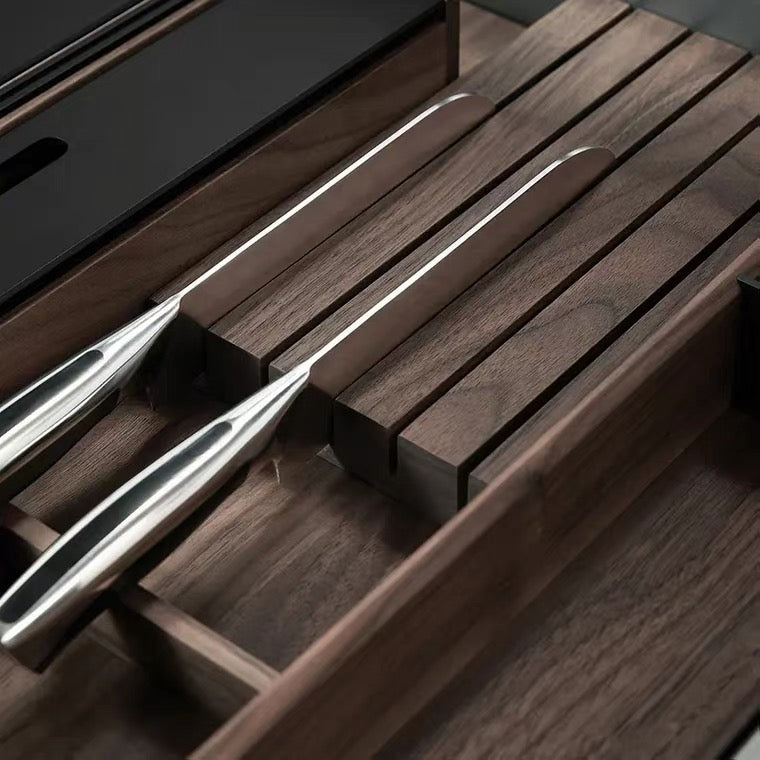 Optimisez l'organisation de votre cuisine grâce à ce panier coulissant doté de compartiments en bois massif magnifiquement travaillés. Conçu pour s'intégrer parfaitement aux meubles bas, il offre des compartiments dédiés pour les couteaux, les ustensiles, les capsules de café et autres petits objets essentiels. Les compartiments découpés avec précision maintiennent tout bien en place, vous permettant de trouver facilement ce dont vous avez besoin en un coup d'œil. Fabriqué en aluminium durable et en bois massif, ce système ajoute à la fois fonctionnalité et chaleur à votre cuisine.