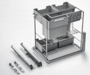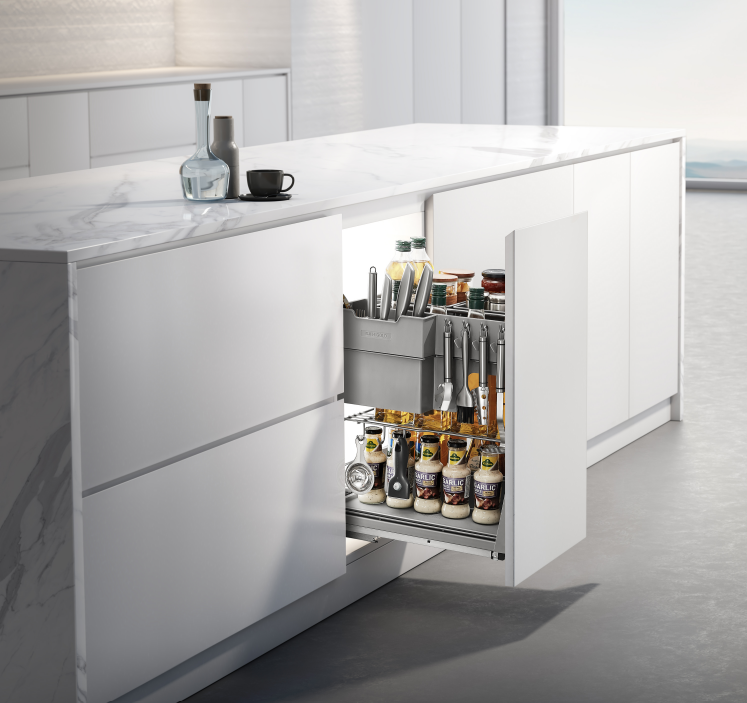 Le panier à assaisonnements coulissant permet de ranger les couteaux en toute sécurité dans des compartiments dédiés et de suspendre soigneusement les ustensiles de cuisine pour un accès facile. Bouteilles et bocaux sont rangés les uns à côté des autres, créant ainsi une configuration ordonnée qui permet non seulement de ranger l'essentiel, mais aussi de rehausser l'ambiance de la cuisine grâce à un parfum d'épices invitant.