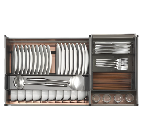 Le tiroir à trois côtés Shearer 4.0 offre une solution de rangement pratique et élégante au design minimaliste. Soigneusement divisé grâce à des cloisons méticuleuses, il offre des espaces dédiés aux bols, assiettes et vaisselle, garantissant que tout reste bien organisé et visible d'un seul coup d'œil.