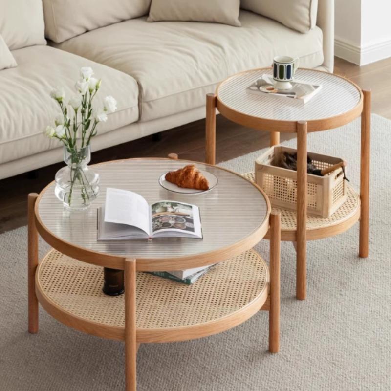 Appréciant avec raffinement la détente, cet ensemble de tables basses rondes apporte textures naturelles et détails soignés aux intérieurs modernes. Idéal pour les coins cosy, les salons ouverts ou les séjours minimalistes, il allie chaleur, fonctionnalité et légèreté visuelle dans un duo intemporel.