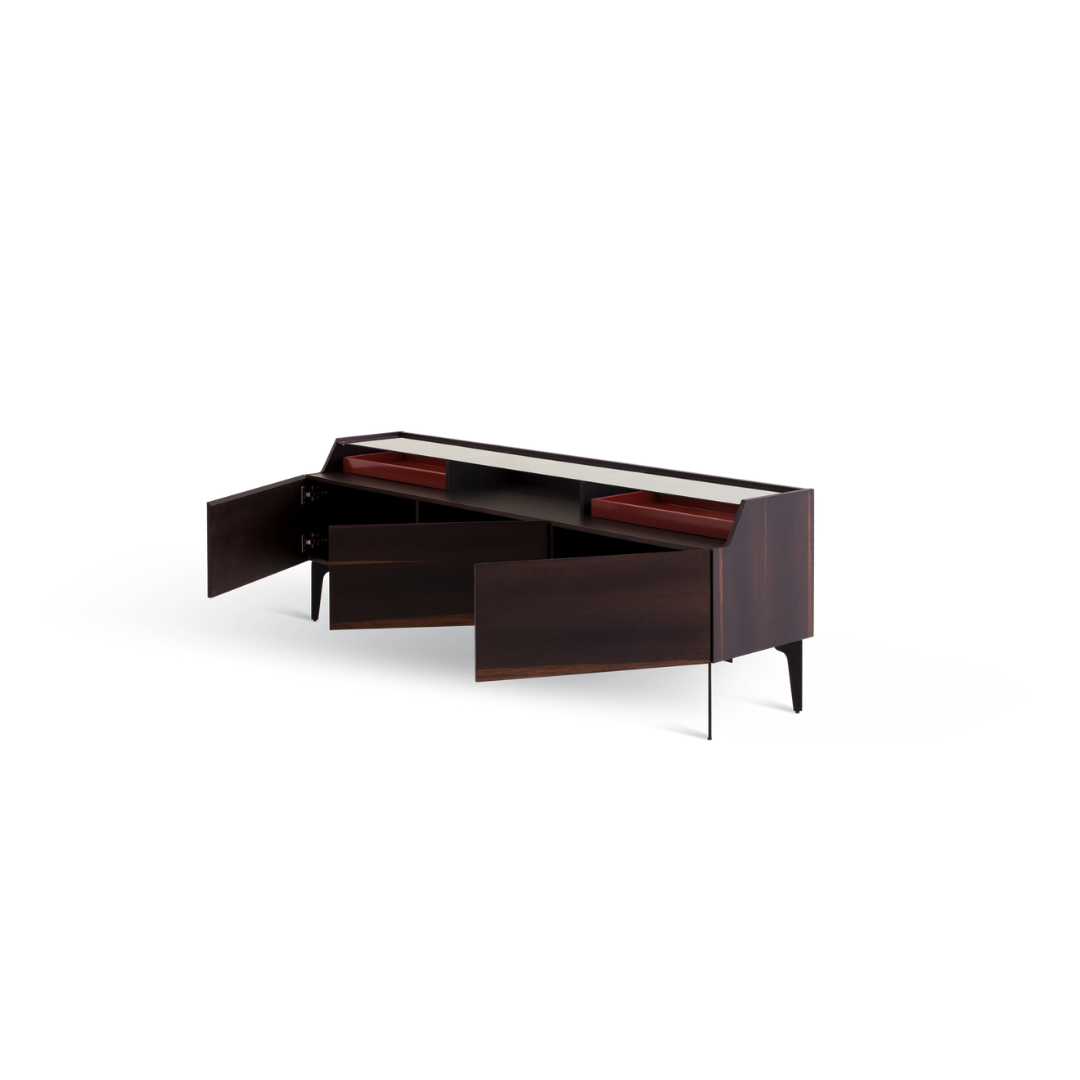 La console TV Solace allie élégance discrète et design pratique. Sa finition en bois foncé respire la sophistication, tandis que l'étagère supérieure surélevée et les subtils inserts de plateau rouge lui confèrent une touche de caractère unique.