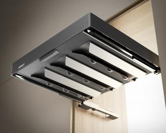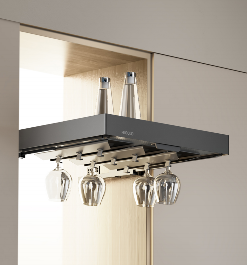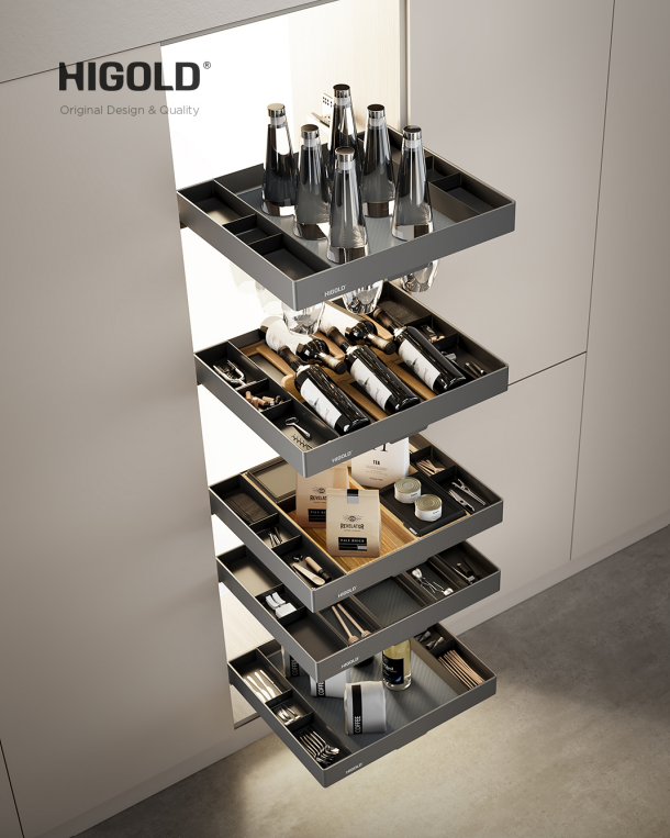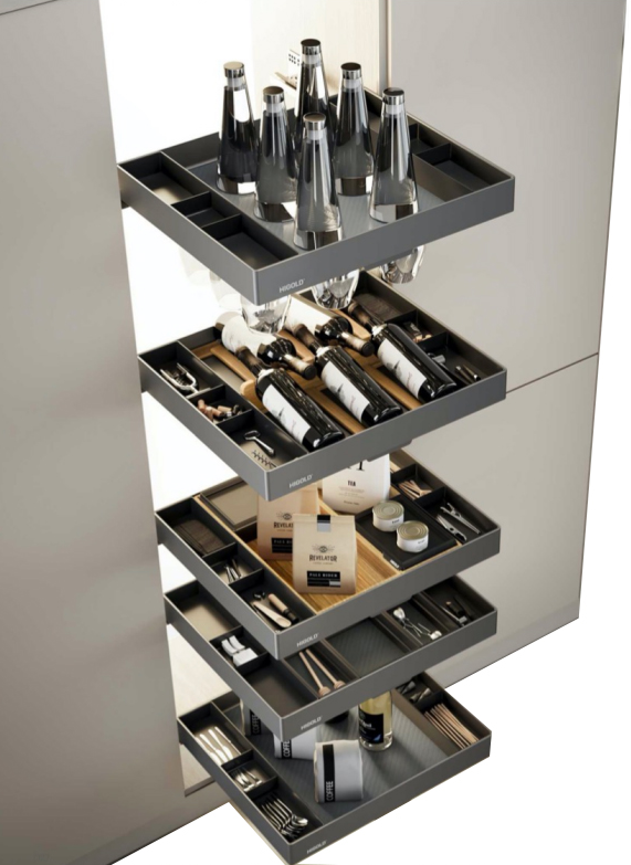 Ce panier coulissant multicouche offre un design astucieux et compartimenté. Bouteilles et bocaux sont rangés sur le niveau supérieur, vins et vaisselle au milieu, et petits objets sont triés sur le niveau inférieur, garantissant ainsi que chaque chose a sa place et reste facilement accessible.