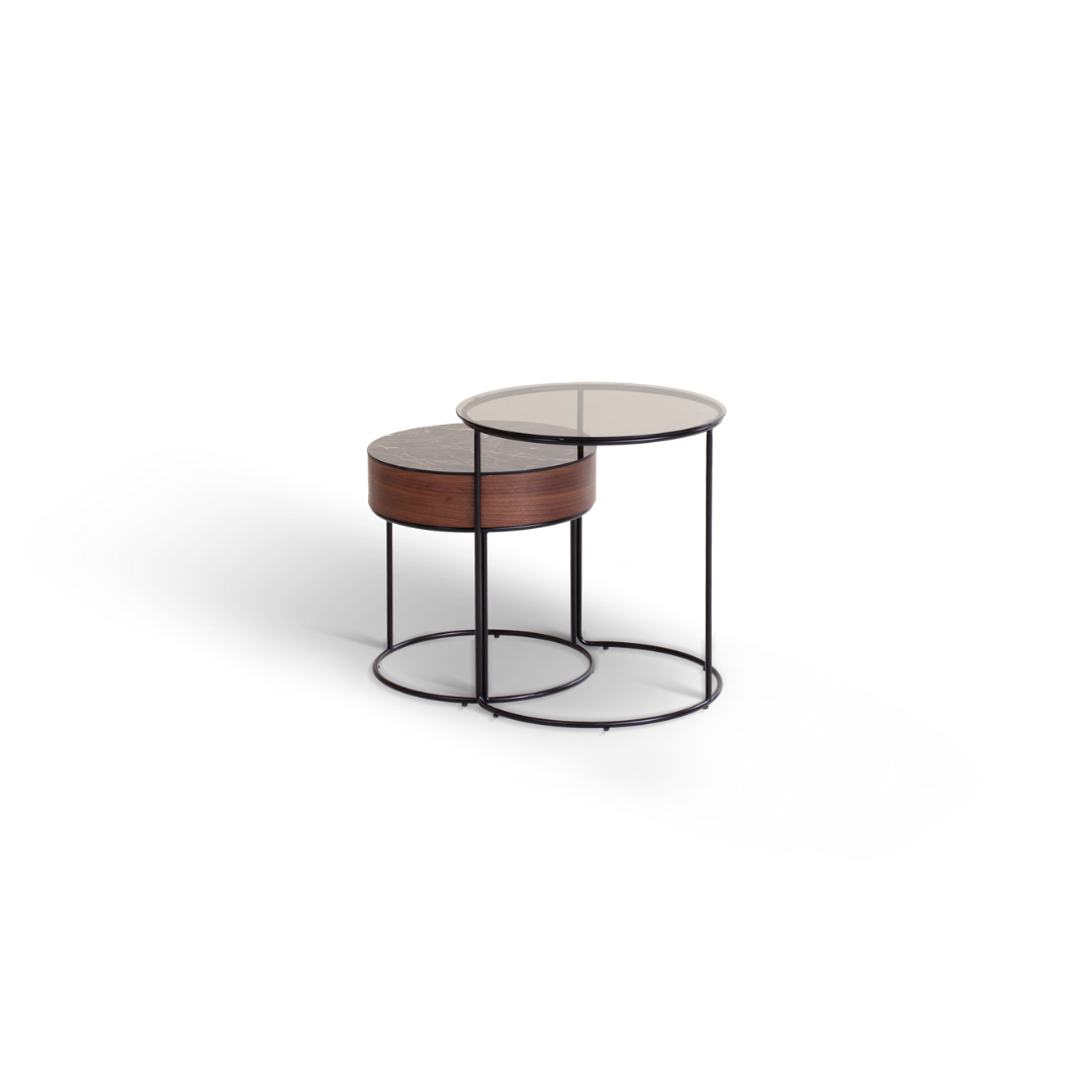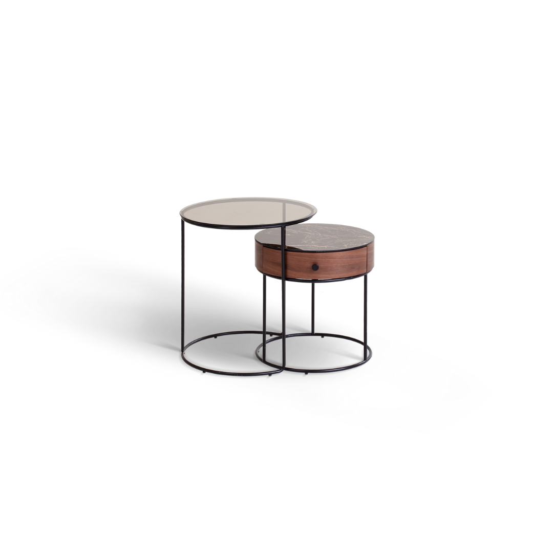L'ensemble de tables gigognes Theodore offre un équilibre parfait entre élégance et fonctionnalité. Doté d'un plateau en verre fumé pour la plus haute table et d'un plateau en noyer riche avec un élégant tiroir pour la plus petite table, ce duo polyvalent apporte une touche de sophistication à tout salon.
