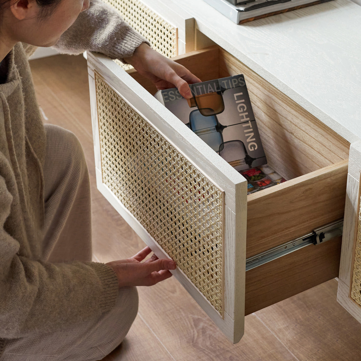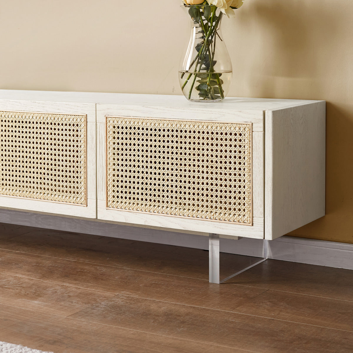 La console TV haute en rotin Yina présente un aspect blanc crème avec une base en acrylique élégante et des portes en rotin aérées, ce qui en fait un choix parfait pour les salons scandinaves et côtiers.