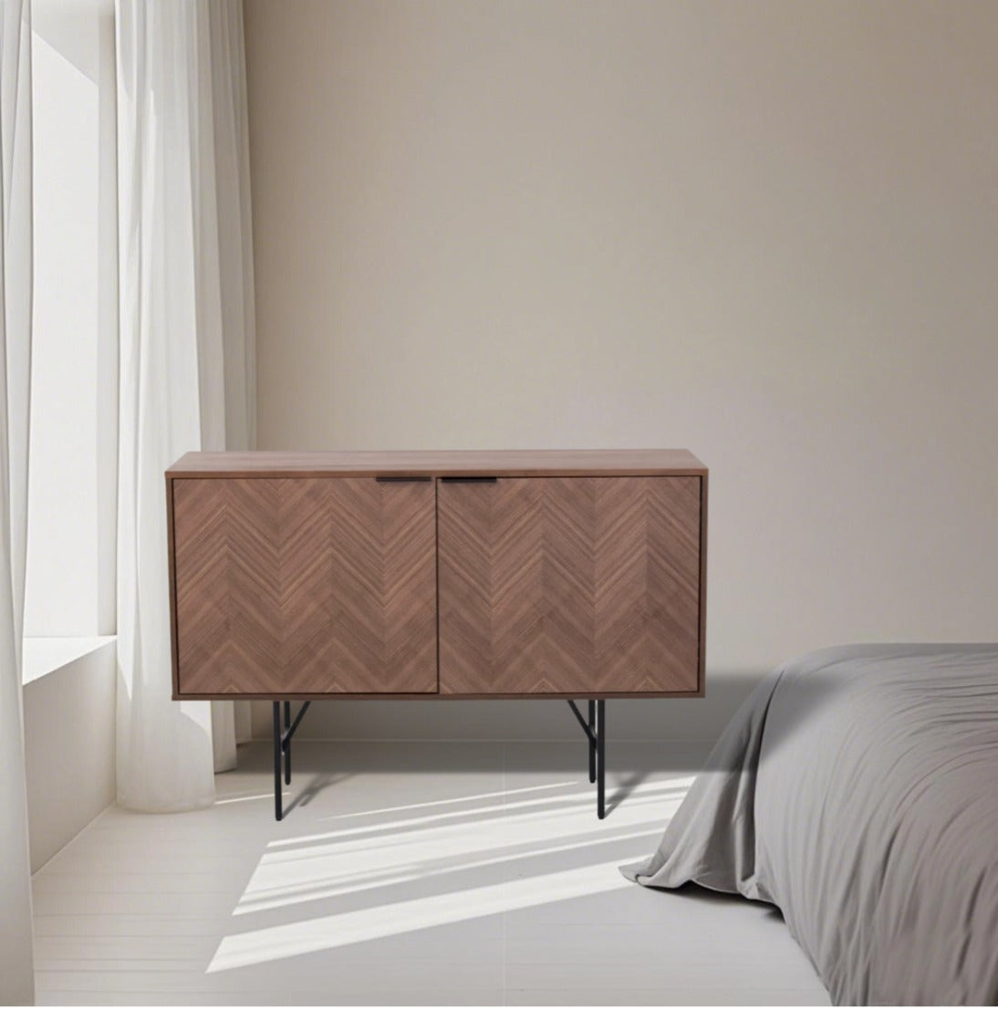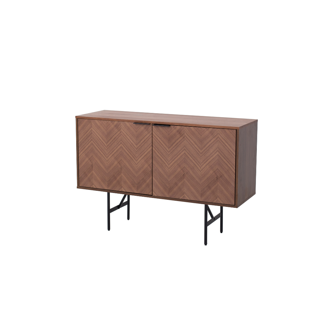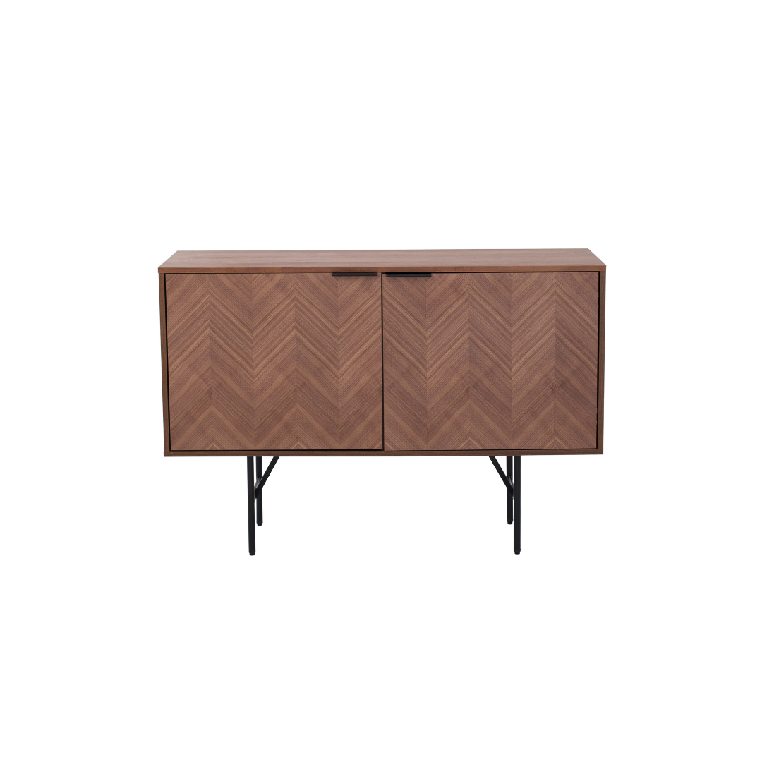 Le buffet Zoé est une solution de rangement chic et moderne. Réalisé avec un placage à chevrons distinctif, sa finition noyer respire la chaleur et la sophistication.